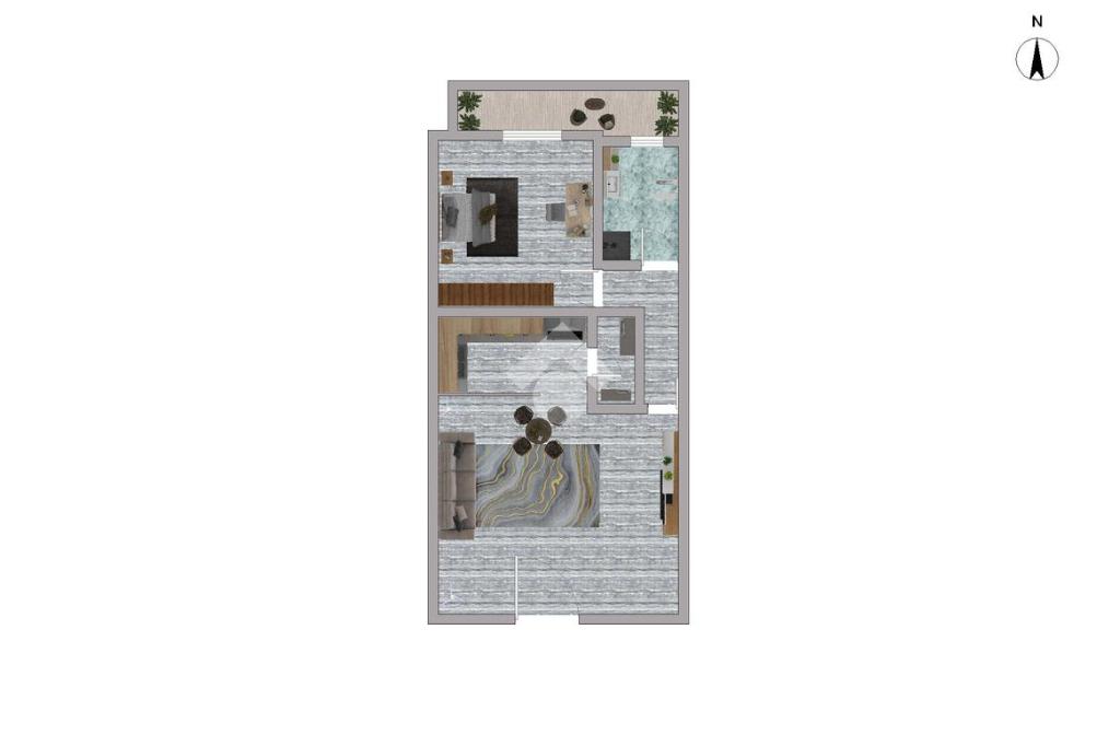 L’accesso avviene dal cortile tramite una scala esterna che conduce all’ingresso dell’abitazione. Gli interni accolgono una zona giorno ampia e luminosa, con angolo cottura ben organizzato e arricchito da una comoda dispensa, ideale per ottimizzare gli spazi.