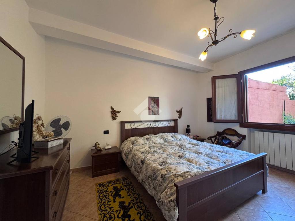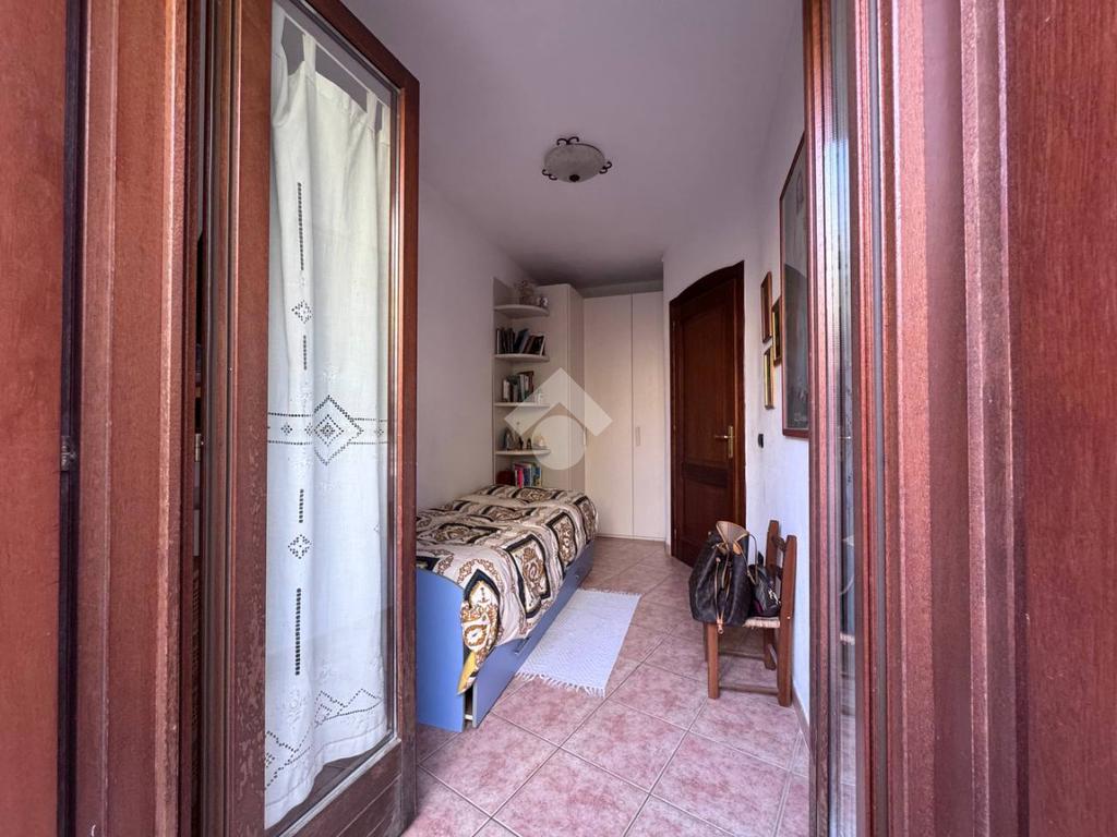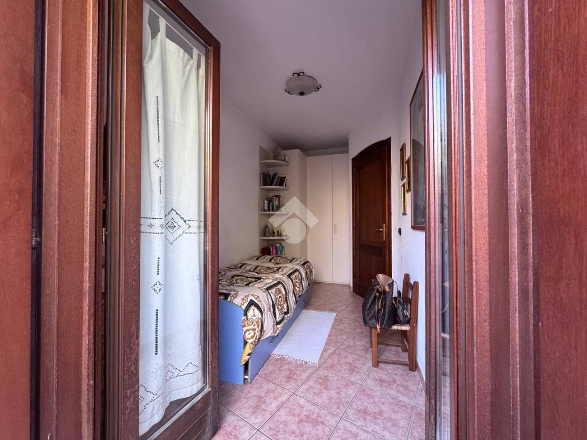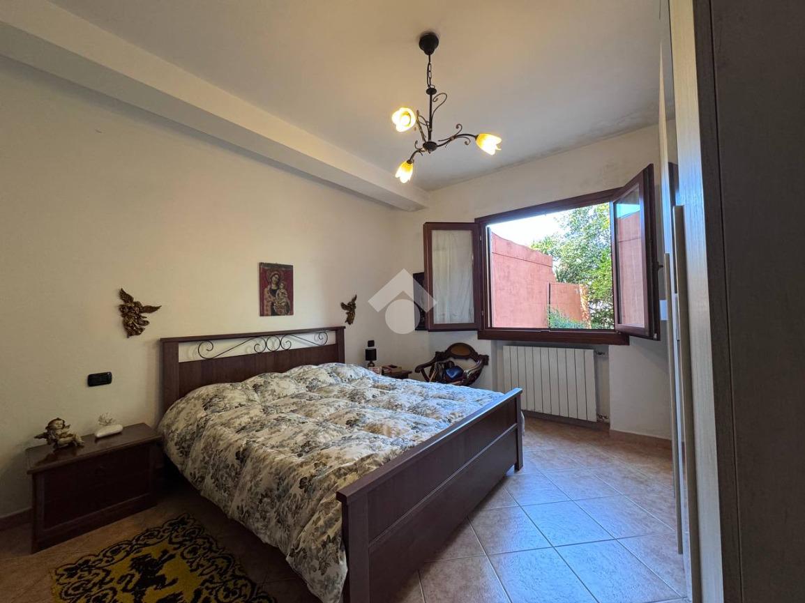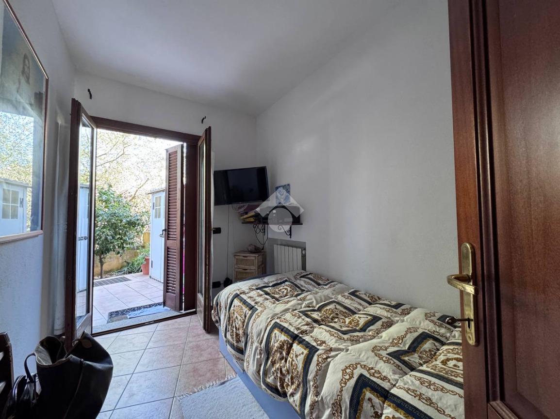 Un disimpegno separa la zona notte, composta da bagno finestrato con vasca, ampia camera matrimoniale e camera singola con porta finestra che consente l’accesso diretto al giardino retrostante.